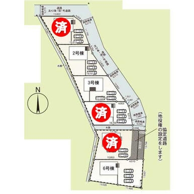 号棟番号:6号棟 ルコニー約9.72平米有り 土地面積に協定通路部分(路地状部分)約41.64平米を含む 敷地内に電柱有り |